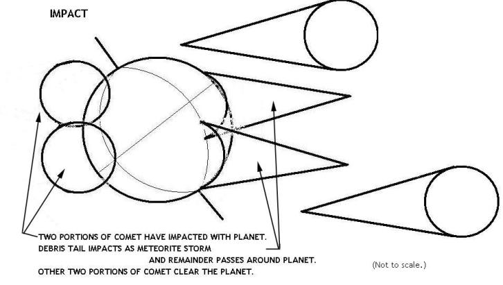 Published September 1, 2012 at 956 × 542 in Skewed Beauty or Skewed Radio-Carbon Dating? Comet During Two portions of fractured comet impact with planet causing deformation. Remaining portions clear the planet. Tail of comet envelopes planet as meteorite storm. ← Previous Next →