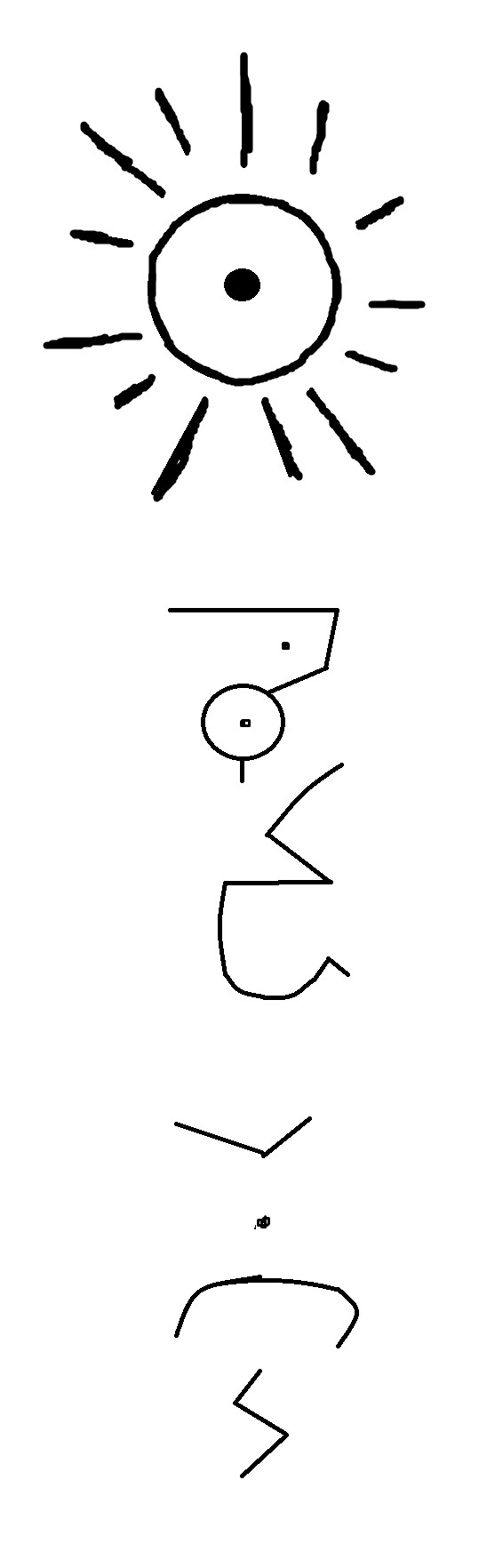 Symbol One: The sun is the most prominent image at the top and since the Loughcrew site is built to capture and measure light we assume this message is then directly related to the site and/or the sun. Another possibility exists that this is a compound symbol and should be seen as a circle and dot surrounded by rays. The circle and dot is SCUTELLA 402 (Latin for shield) pronounced “sa”. The word “sa” in Old English means bucket.