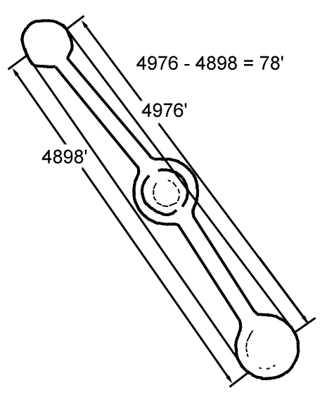 But something is missing….. Three circles all in a row with one small and two large gives us 1 and 2 or 12, or the number of houses of the zodiac at 30 degrees each. The overall length of the structure becomes 5630 feet. It needs to be a few feet larger or smaller. If we push the circles out of alignment we can change the overall length to 5600 feet and we do it in a manner so that the tangents drawn from each side of the outer circles differ in length by the final magic number 79. Indeed, because the first circle is of a radius of 320 feet and we desire an overall length of 5600 then the center of the first circle lies exactly one mile, 5280 feet, from the outer edge of the furthest circle. To do this the structure must bend about 5 degrees. Almost perfect…. We can perfect it by making the paths between the circles 200 feet across or 2400 inches for the hours in the day and this will mean the area of the upper path is 7.94 acres (nearly the desired 7.92)  and the lower becomes 7.07 acres.