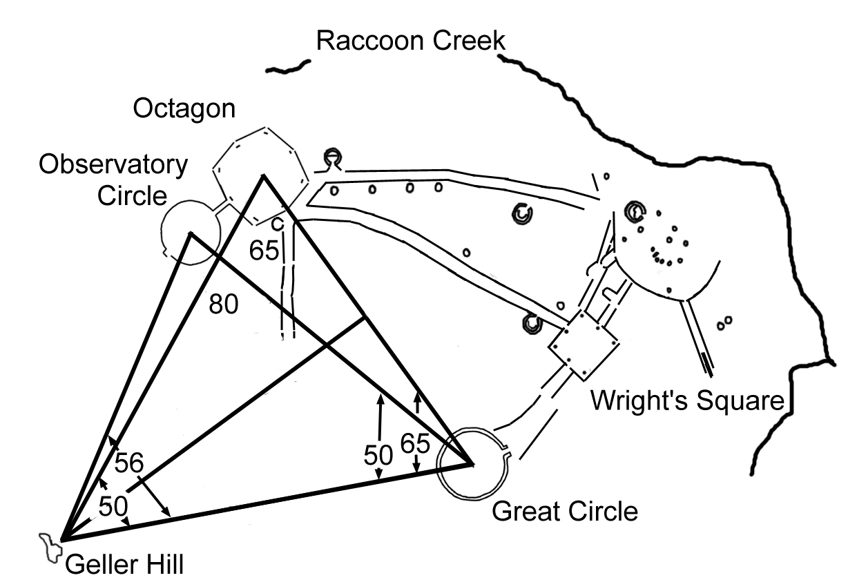 Isosceles triangles formed at Newark, Ohio Earthworks. Positions as located by satellite image. Drawing by B.L. Freeborn, 2013.