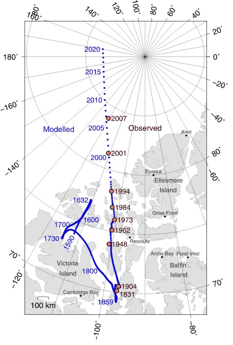 Observed pole positions taken from Newitt et al., “Location of the North Magnetic Pole in April 2007”, Earth Planets Space, 61, 703–710, 2009 Modeled pole positions taken from the National Geophysical Data Center, “Wandering of the Geomagnetic Poles” Map created with GMT. CC BY 4.0 Cavit