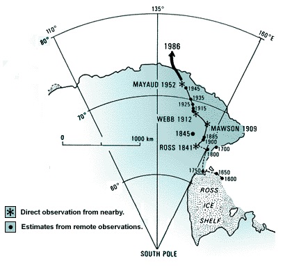 NOAA National Geophysical Data Center – Locations of Magnetic South Pole, or dip pole, over time. Comparison of direct observations with model predictions. http://www.ngdc.noaa.gov/geomag/image/south_dip_poles.png