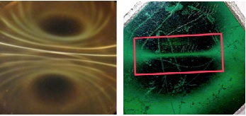 Bloch Wall /Dielectric Plane as seen with Ferrocell (left) and with viewing film (right). Photos by Ken Wheeler, “Uncovering the Missing Secrets of Magnetism.”