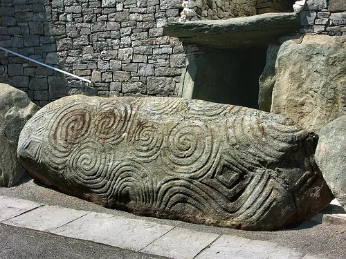 Newgrange, Ireland is a large pre-historic monument called a passage tomb. It is older than the Great Pyramids. In front of it sits what is called a kerb stone adorned with Neolithic art.