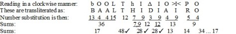 The round stone on a peg in the NW arch is as indicative of Baal as a cross is to Christ. (The >OI< stones.) Furthermore, it would seem the stone letters spell out Baal. This leads to studying the ‘inscription’ as if it is of Baalist origin and if so, certain numbers must be present. Validating North American Runic Inscriptions describes how certain numbers are embedded in Baalist inscriptions. One should recall that the Catholic Church went to great lengths to stamp out paganism in the time preceding, during and after Henricus’ tenure as Bishop. Apparently, Baal was central to that religion which is why there are so many references to it hidden in runic riddles. The dedication to Baal at Newport tower is unmistakable. The stone letters are repeated here: