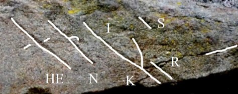After studying Eagan’s discovery, the other letters shown above were identified. There are eight arches. Three of which have one letter displayed and five display two each. There is also a round stone on the interior opposite the >OI< stone which is on the northwest side. This makes fourteen altogether. To complicate the picture there is a runic inscription found over the southwest pillar (see images below). It was translated by Mongé (1967) and it reads Henricus 1116. This refers to Bishop Henricus from Greenland that was sent to Vinland. He is known as Bishop Eirik Gnupsson in Icelandic annals. Other theories as to the tower’s origin abound. The Henricus theory is at least supported by an inscription imbedded into the tower itself in the manner of a corner stone.