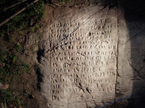 The runestone is composed of two parts. There is an extensive inscription in runes on the left and higher up on the rock to the right is a ship in a Viking style. Dr. Henrik Williams was first to study the inscription and will be publishing a paper on the topic. In the meantime, a video is available where he discusses the stone with David Pompeani. (YouTube link here.) In that discussion, he states that often a runic inscription has no relation to the art presented and that the two parts may have been done by different people. That seems to be true here. Indeed, the reader can see easily that the long inscription was done with a sharper, finer tool while the ship was done with a more blunt tool and a much stronger arm. Dr. Williams has identified the inscription as a protestant version of the Lord’s Prayer in modern Swedish. The inscriber did not date the inscription which leaves room for some discussion. It is believed to be of 17th to 19th century origin.