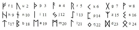 A date is given and it appears to be 1224. The carving is on 2 lines with 4 groups which suggests 24. Furthermore, each year in the 532 year cycle of the Perpetual Easter Table has a unique set of three numbers. This year is found on the 4th line with GN 9 and day letters 6 and 7 (a leap year). The latter two numbers are obvious in the carving. There are four symbol groups in the carving and there are four O’s which suggest the line number. The Elder Futhark value for H is 9.