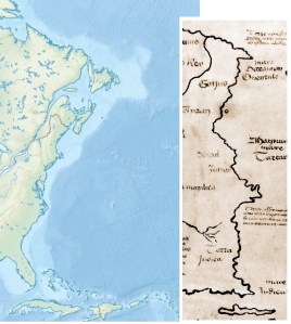 What is superbly depicted on this strange map? Obviously, the depiction of Greenland is near perfect. How about the entire eastern seaboard from New Foundland to Cuba? How about the depiction of the Mississippi River? Then there is the depiction of the St. Lawrence Seaway. There is even a lovely picture of Niagara Falls in the 12th century before Goat Island was separated from the shore. OM or more properly, King Oystein Magnusson, included his beloved lake in Scotland where he was born. He also hinted at the location of his son’s grave and the monument he placed on it. This is the Rök rune stone in Sweden. There is also a rudimentary and awful depiction of Hudson Bay in a tiny Vinland in the upper left corner.