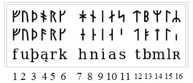 The runes at the top center are transcribed as M I L T I A K I and correspondingly the numbers in Futhark are: 14 9 15 12 9 10 6 9.