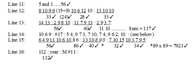 There are 3 words on 2 lines for 32.✓ The sum of the top line is 74. The sum of the second line is 51.✓ The total sum is 125. The first number is 8 and the second bindrune is 9. Recall 89 x 89 = 7921.✓ The sum from 15 to the last 6 is 40.✓ The first number is 8 and the last number on either line is 6 suggesting 86.✓ The sum on the left bottom is 45. The sum between the 6’s is 45. Add a 6 from either side and obtain 51 again.✓ The R and K adjoining each other provide 56.✓