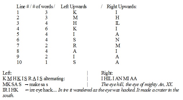 Very similar to the Kensington and the Kingigtorssuaq Inscription, the first letter, H, has value 7 and there is a 2 and 9 on the following line or 792.✓ The next numbers (8,15,10, 8,2) sum to 43.✓ The last two are 8 and 2 or 28 in reverse.✓ On the left there are 3 word groups on 2 lines or 32.✓ On the right there are 4 word groups on 3 lines or 43.✓