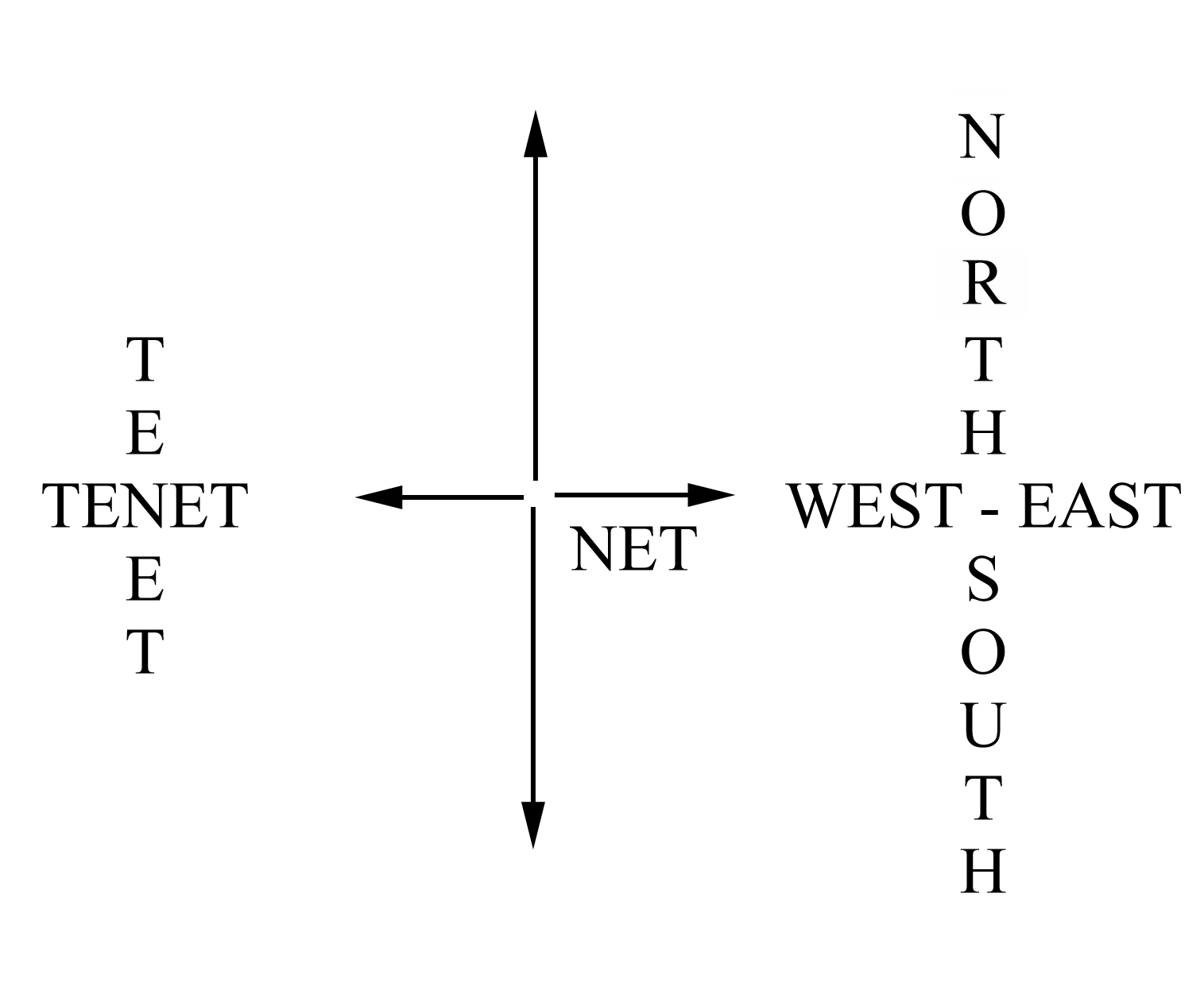 In other words; North, South, East and West are at 90 degrees to each other and each is depicted by the word NET fanning out from the center.
