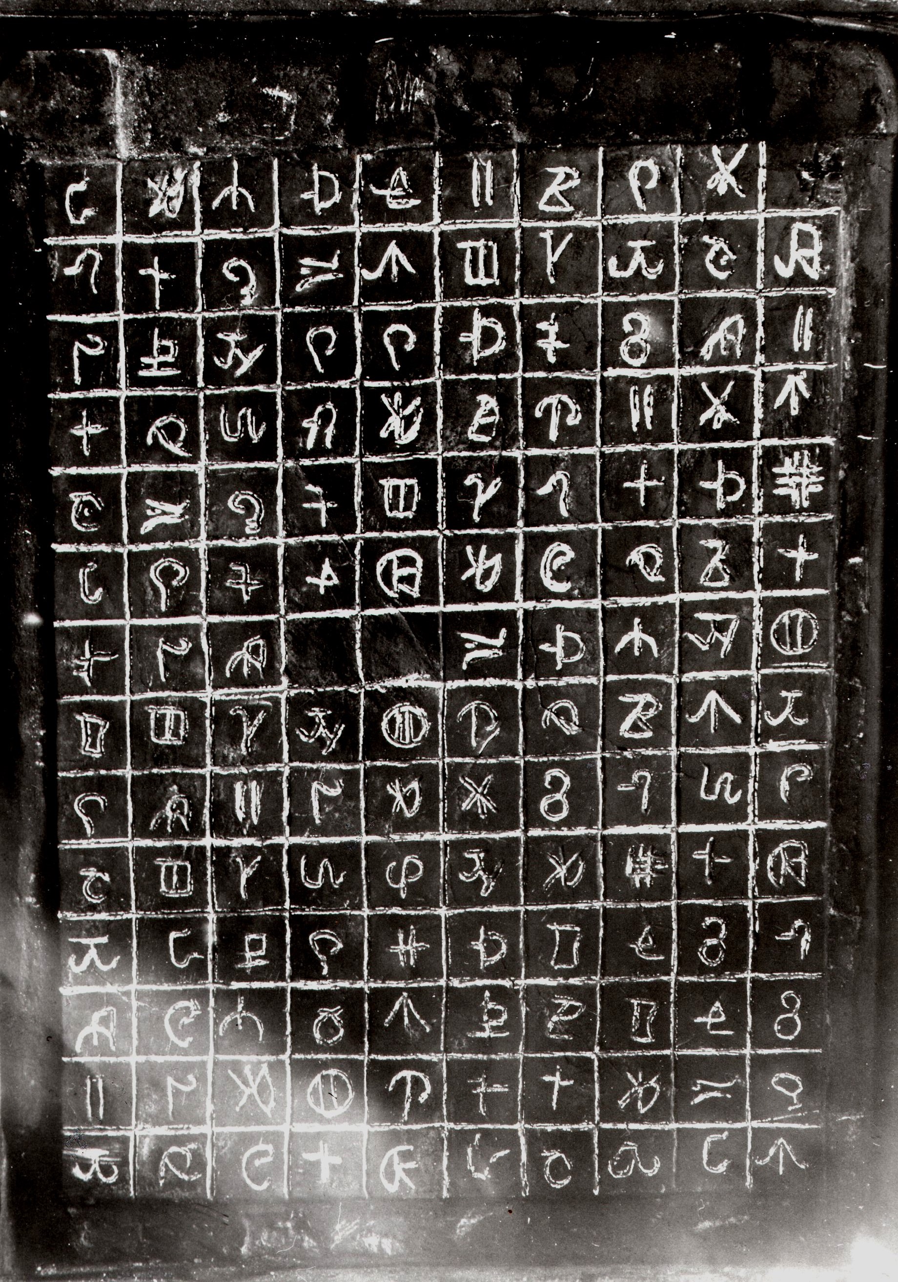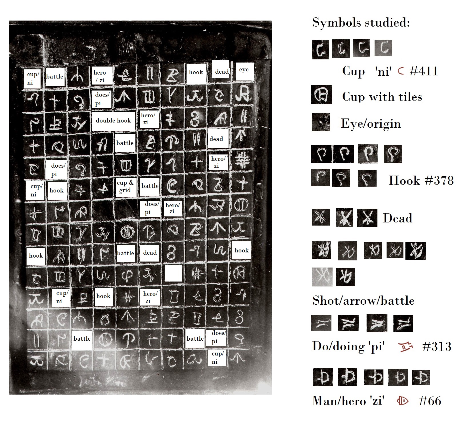 The last symbol is at 1,4 and looks like the head of a shovel or a D with a side bar. It also appears in the glyph list at #66 and is said to mean men or hero with sound ‘zi.’ It appears five times at: 1,4; 3,6; 5,9; 7,7; and 11,6.