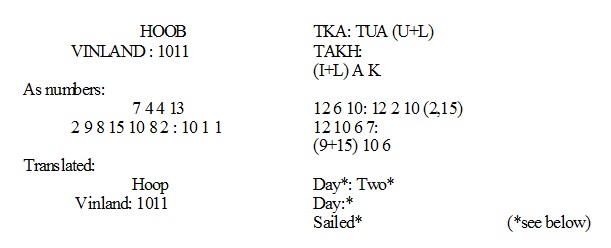 MB : UINA : SHIB : UIDH is almost straightforward plain text: move Vine ship with ⇒ moved to Vineland on a ship with…. Also find DOA running down with another A below and to the side N,M which implies …Doa (name). The runes in the square UID /HO spell out: HU I DO ⇒ how I do. The last H begins the ‘hack here Rhode Island 1214’ found previously which runs vertically to the right.