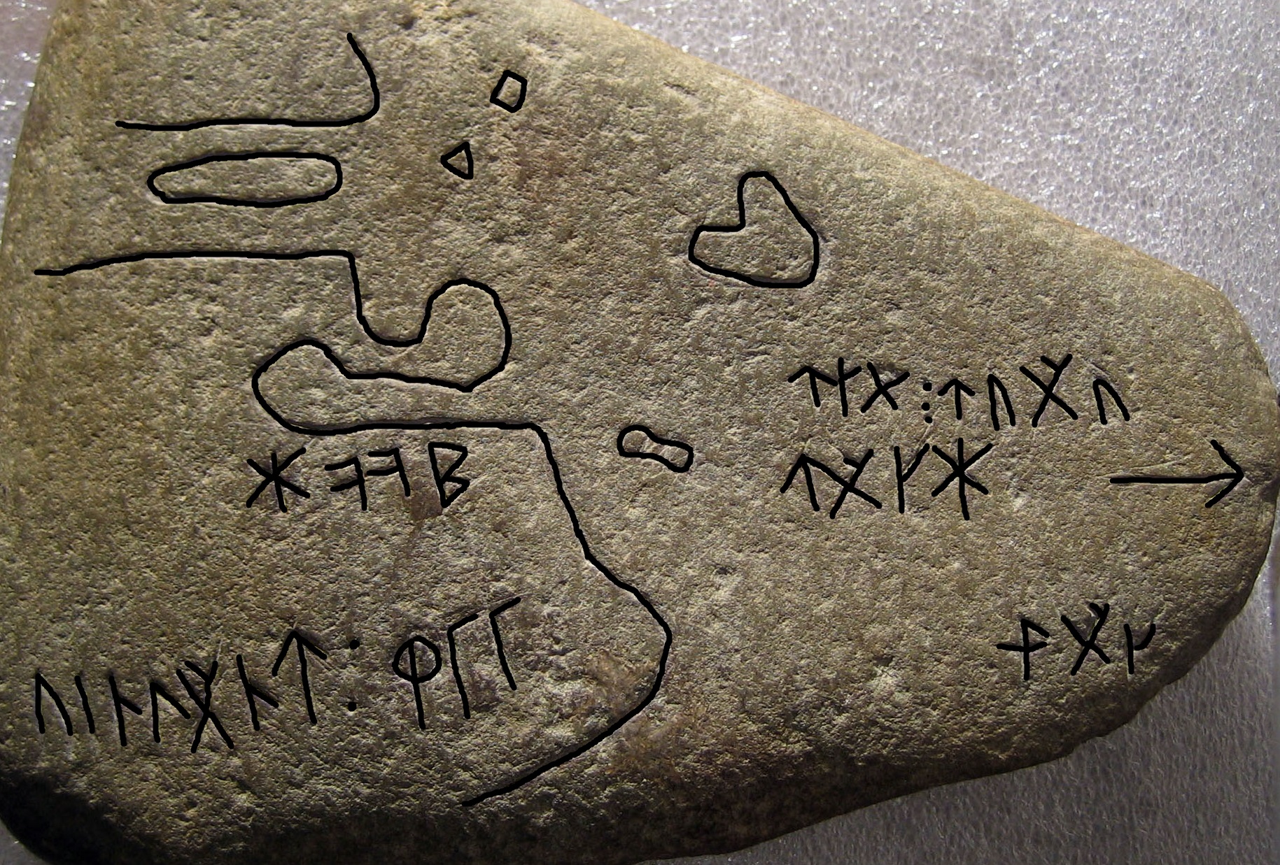 The Spirit Pond Stone with the longest inscription is studied here. There are several plain text readings that have been done, which are vastly different from what is presented. For the most part, the inability to read the stone has led professionals to assume it is fake. It is suggested that this is a riddle, a sort of cross-word puzzle and like any cross word it cannot be ‘read’. One must read this stone’s letters up and down, sometimes backwards, and often as anagrams. Consider it is a puzzle laboriously designed for amusement and the telling of a story. They are meant to take a lot of time to solve so …. do not expect to get it by just ‘reading.’ And since there might be mistakes here, feel free to disagree. In the paper entitled “Validating North American Runic Inscriptions” (PDF), by this author, the Spirit Pond Rune stones were discussed briefly. Reading the first paper is essential to understanding the importance of the numeric information that is given here and followed by ✓ marks. The ciphers in The Inscription Stone (SP-3) are extensive. This is the most thorough study of these inscriptions to date. It follows the work of others who began this study many decades ago. It completes it except for the preservation of the original works. It is up to the reader to motivate those who can. There are four stones from Spirit Pond, Maine that Scott Wolter discusses in The Hooked X: Key to the Secret History of North America. Cyrus Gordon discusses them in Riddles in History. O.G. Landsverk discusses Alf Mongé’s study of them in his books. The Inscription stone (SP-3) has ten lines on the front and on the back there are 5 full lines with the start of a 6th. And thus it begins 56.✓ Apologies are given in advance. This is end to end numbers which makes for poor reading. Do not let the number work deter one from discovering what lays within the inscriptions. The essence can be grasped regardless of the level of interest in the math. Back to TopSP-3 Inscription Stone
