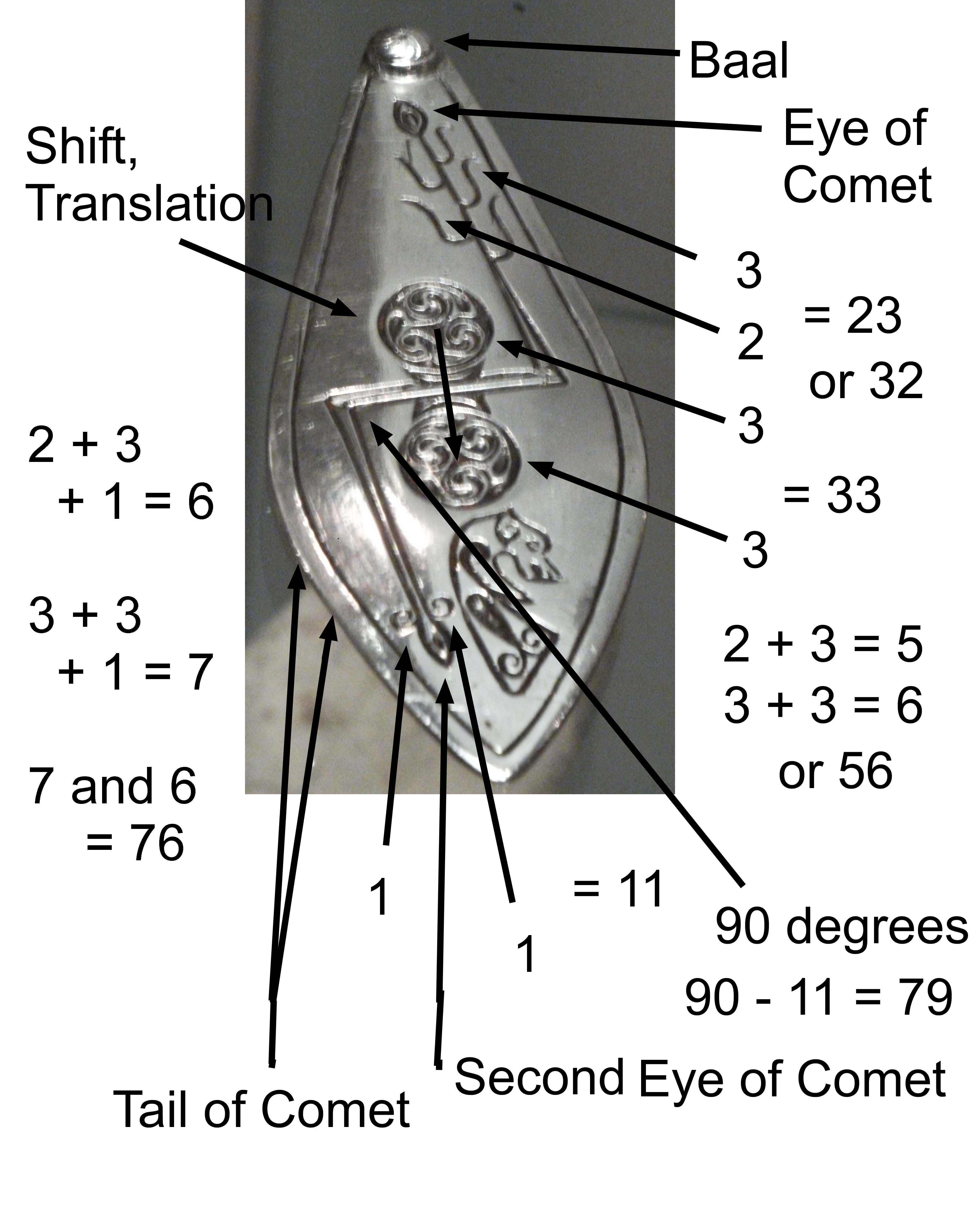 Indeed, the stone even shows a Proto-Canaanite/Hebrew/Phoenician letter H at the bottom which has value 8. And to what does 8 refer? English creates a pun of the word eight. It is ate. Are they saying it ate the planet just as the Beltane-Newark story tells? But there is a dot punched into the upper line. Is it to be read 8 – 1 or 80 -1 = 79? Or does it mean the grid of measurement (longitude and latitude) was damaged? But on other stones 6 lines extend down from the H. This gives 8 + 6 = 86 for the Sun. There may be lines here as well but the weather takes from us what we would know. This H is called the “comb” in Pictish art descriptions.